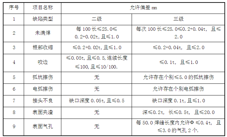 5、鋼結(jié)構(gòu)焊接:焊條、焊絲、焊劑等焊接材料與母材的匹配應(yīng)符合設(shè)計(jì)要求及現(xiàn)行行業(yè).標(biāo)準(zhǔn).《建筑鋼結(jié)構(gòu)焊接技術(shù)規(guī)程》JGJ81 的規(guī)定,焊條、焊絲、焊劑在使用前按其說(shuō)明書(shū)及焊接工藝的規(guī)定進(jìn)行烘焙和存放。焊工須持證上崗,在其認(rèn)可范圍內(nèi)施焊,焊接時(shí)采用合理的焊接工藝,以減少由焊接產(chǎn)生的變形和應(yīng)力,確保焊縫和構(gòu)件的質(zhì)量。本工程零部件連接處均需滿焊,焊縫厚度按設(shè)計(jì)要求,焊接時(shí),盡量減少接縫數(shù)量,拼接應(yīng)按等強(qiáng)度連接原則,選擇合適的焊接工藝和剖口形式,并設(shè)置在預(yù)應(yīng)力較小部位,焊縫表面不得有裂紋、焊瘤等缺陷,表面無(wú)氣孔、夾渣、弧坑、電弧擦傷等缺陷,焊縫不得有咬邊,未焊滿根部收縮等缺陷,力求做到外形均勻,成型較好,焊縫與焊縫,焊縫與基層過(guò)渡平滑,焊渣和飛濺物須清理干凈,二、三級(jí)焊縫處外觀質(zhì)量標(biāo)準(zhǔn)見(jiàn)下表: